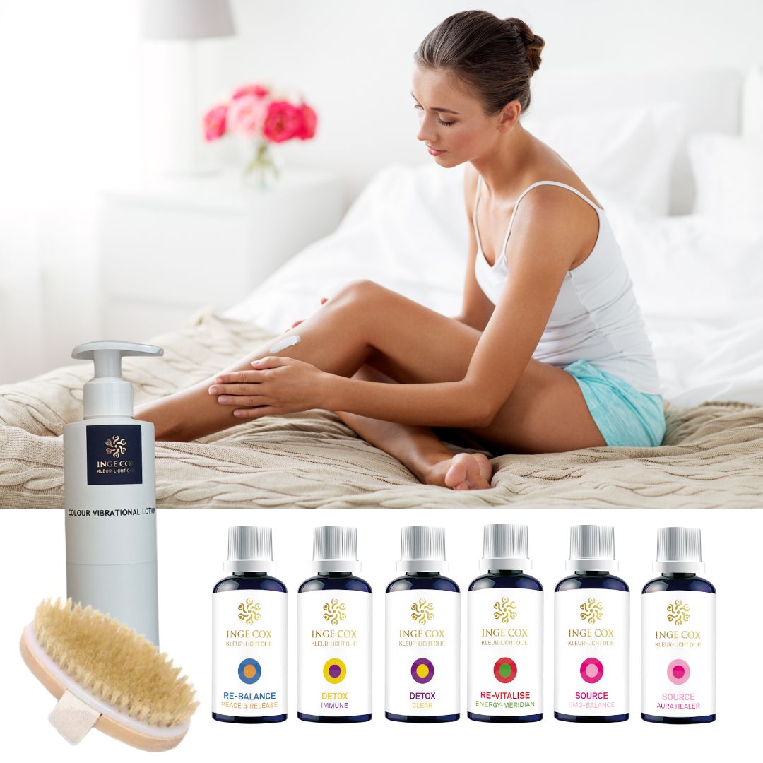 De Gift set Kleur-Licht olie 2 bevat een Kleur-Licht olie naar keuze (30 ml) en een Basis voor Lotion (250 ml), waarmee je eenvoudig een gepersonaliseerde blend maakt die precies past bij jouw behoefte van het moment. Zo ontstaat een unieke verzorging die huid en energie tegelijk voedt en laat stralen.